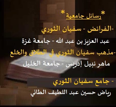 – فقه الإمام سفيان الثوري: -1- جامع سفيان الثوري *رياض حسين عبد اللطيف الطائي -2- الفرائض – سفيان الثوري: *رسالة جامعية : أبي عبد الله عبد ... -